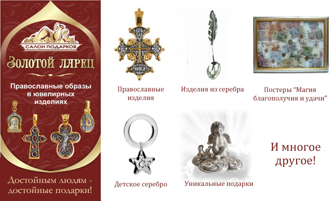 Салон подарков "Золотой ларец" предлагает широкий ассортимент подарочной продукции, среди которого Вы, вне сомнения, сможете отыскать оригинальный и запоминающийся подарок для себя, Ваших близких или коллег. В нашем салоне широко представлены: монеты и слитки из золота и серебра, столовые серебряные приборы и посуда, нательные подвески, выполненные из серебра и золота.